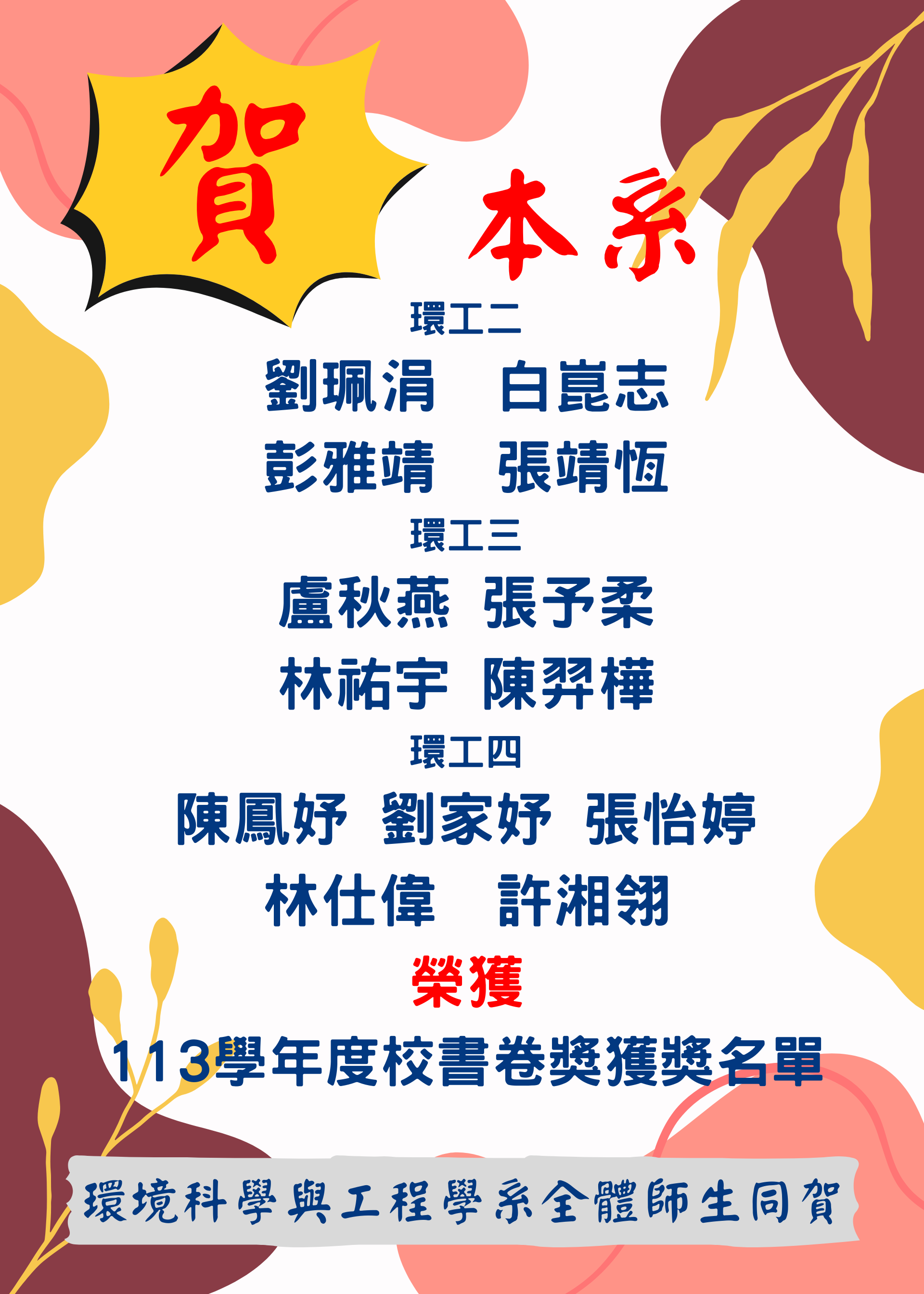 113學年度校書卷獎獲獎名單