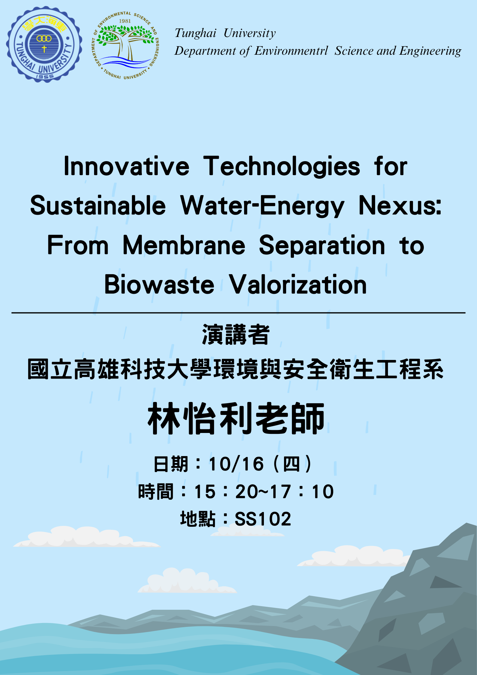 專題演講-Innovative Technologies for Sustainable Water-Energy Nexus: From Membrane Separation to Biowast